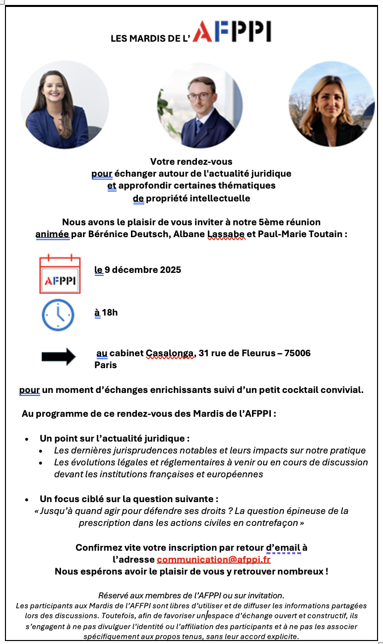 - 9 décembre 2025 à 18h : 5e Mardis de l’AFPPI pour une nouvelle séance d’échanges sur l’Actualité PI et un Focus sur