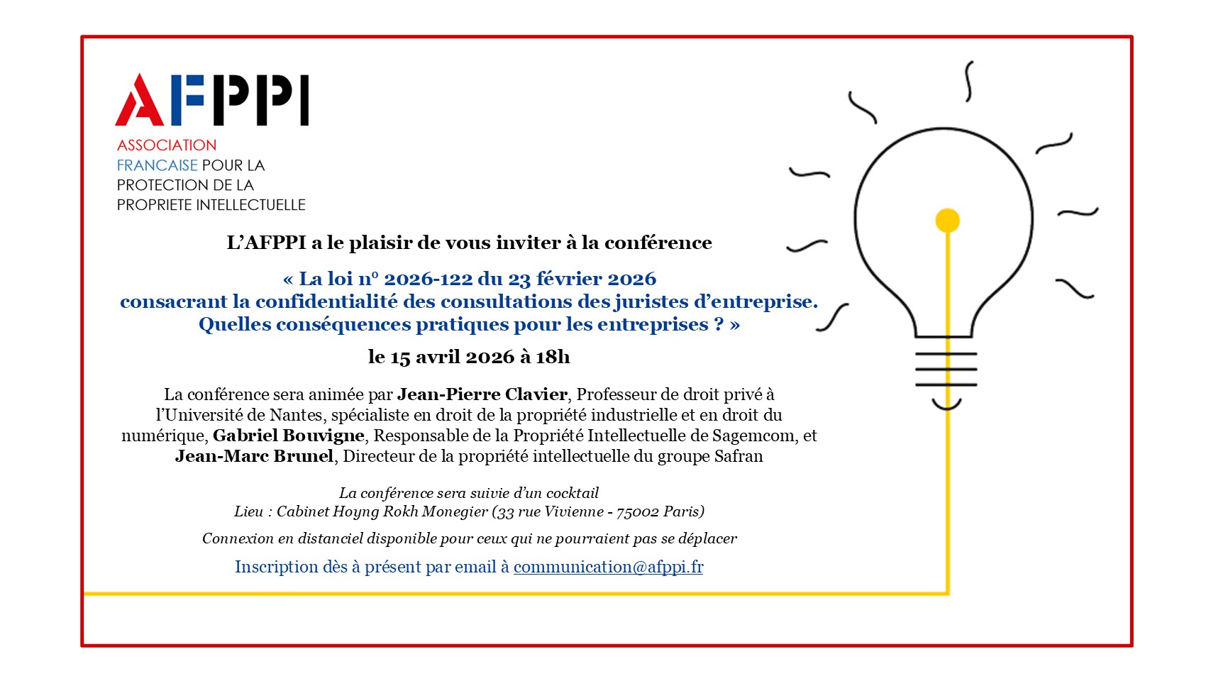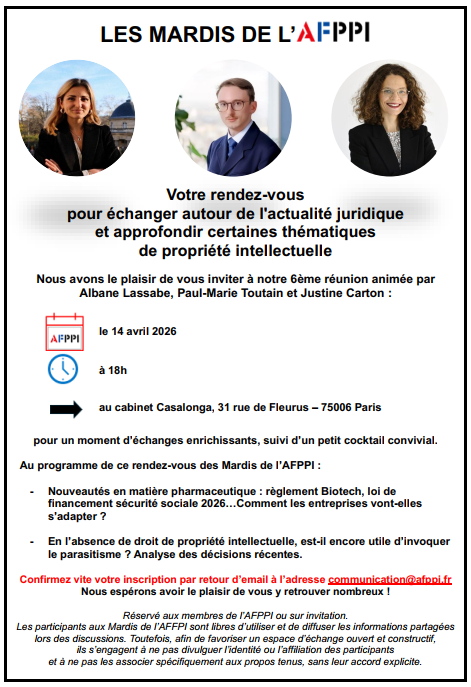 - 14 avril 2026 à 18h : 6e Mardis de l’AFPPI pour une nouvelle séance d’échanges sur les dernières Actualités de la PI et un Focus sur :